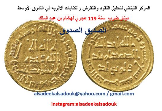 المركز اللبناني لتحليل النقود والنقوش والكتابات الاثريه في الشرق الاوسط دينار اموي لهشام بن عبد الملك سنة 119 هجري Umayyad Gold Dinar Hisham B Abd Al Malik 119h