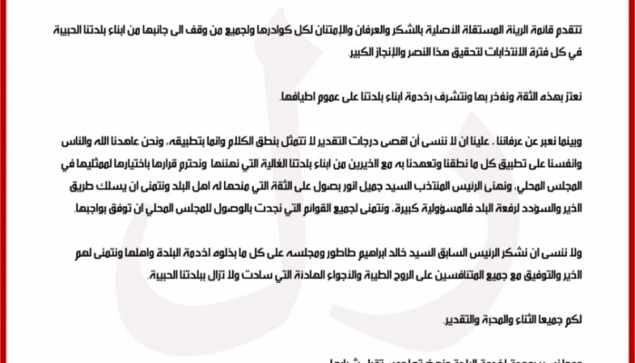 شاشة نت رسالة شكر وعرفان إلى أهالي الرينة من قائمة الرينة المستقلة الأصلية